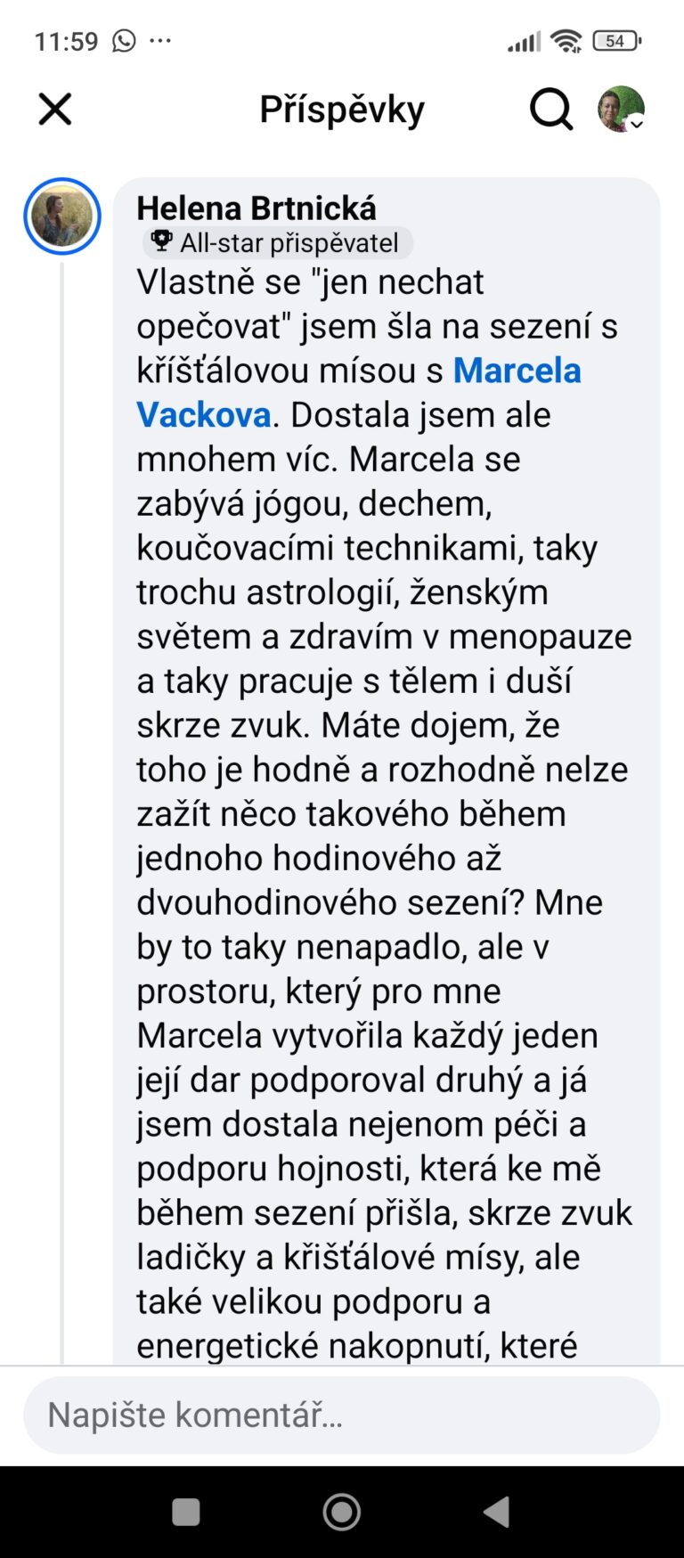 "Na harmonizaci jsem šla po psychicky náročném týdnu. Teď už je to pár dní a pořád se cítím vyladěná a uvolněná. Na začátku je dech a jemná masáž rukou a chodidel vybraným olejíčkem, už to zklidní a naladí. Potom se už necháte léčit a harmonizovat zvukem. Vždycky jsem se trochu "bála" frekvencí, protože trpím na silné migrény, ale úplně zbytečně! Účinek ladičky čaker a hlavně křišťálové mísy je naprosto skvělý, hlava při něm vypne a vyčistí se...přichází uvolnění, napojení, uvědomění, pouštění...pocit jako bych se vznášela ve vzduchu - zkrátka zvukové lázně. Nakonec přišly na řadu karty, a ty vždycky "ví" a nasměrují. Toto si potřebujete dopřát! Děkuju Marcele za další zkušenost a těším se příště." Adéla B.